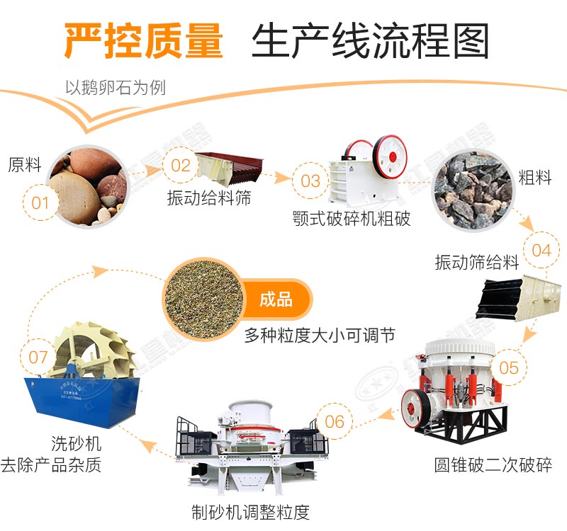 天然原石經振動給料機送入顎式破碎機內進行初步的破碎,經過振動篩篩選,合格部分繼續(xù)送入細碎機進行打沙加工,對于粒度要求嚴格的生產線,可以接入振動篩,多重篩分能夠進一步優(yōu)化成料品味,細化分級,成品砂料品味更好,級配更合理。